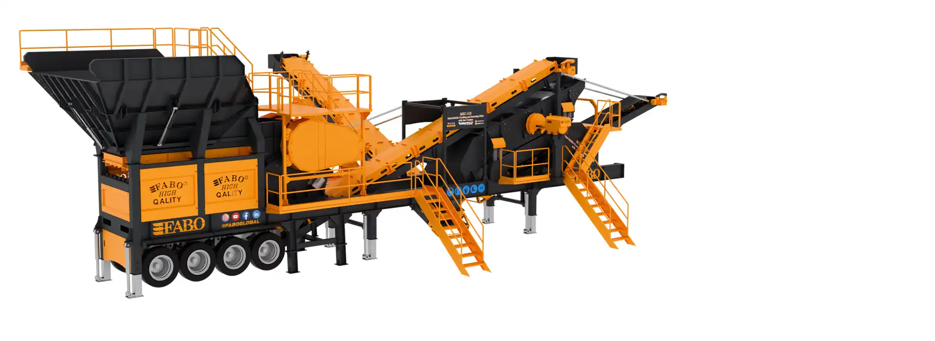 MJC-110 modeli, tek şase üzerinde sistematik bir düzenle; titreşimli besleme bunkeri, bypass bandı, çeneli kırıcı, titreşimli elek, stok bantları ve otomasyon sisteminden oluşmaktadır.