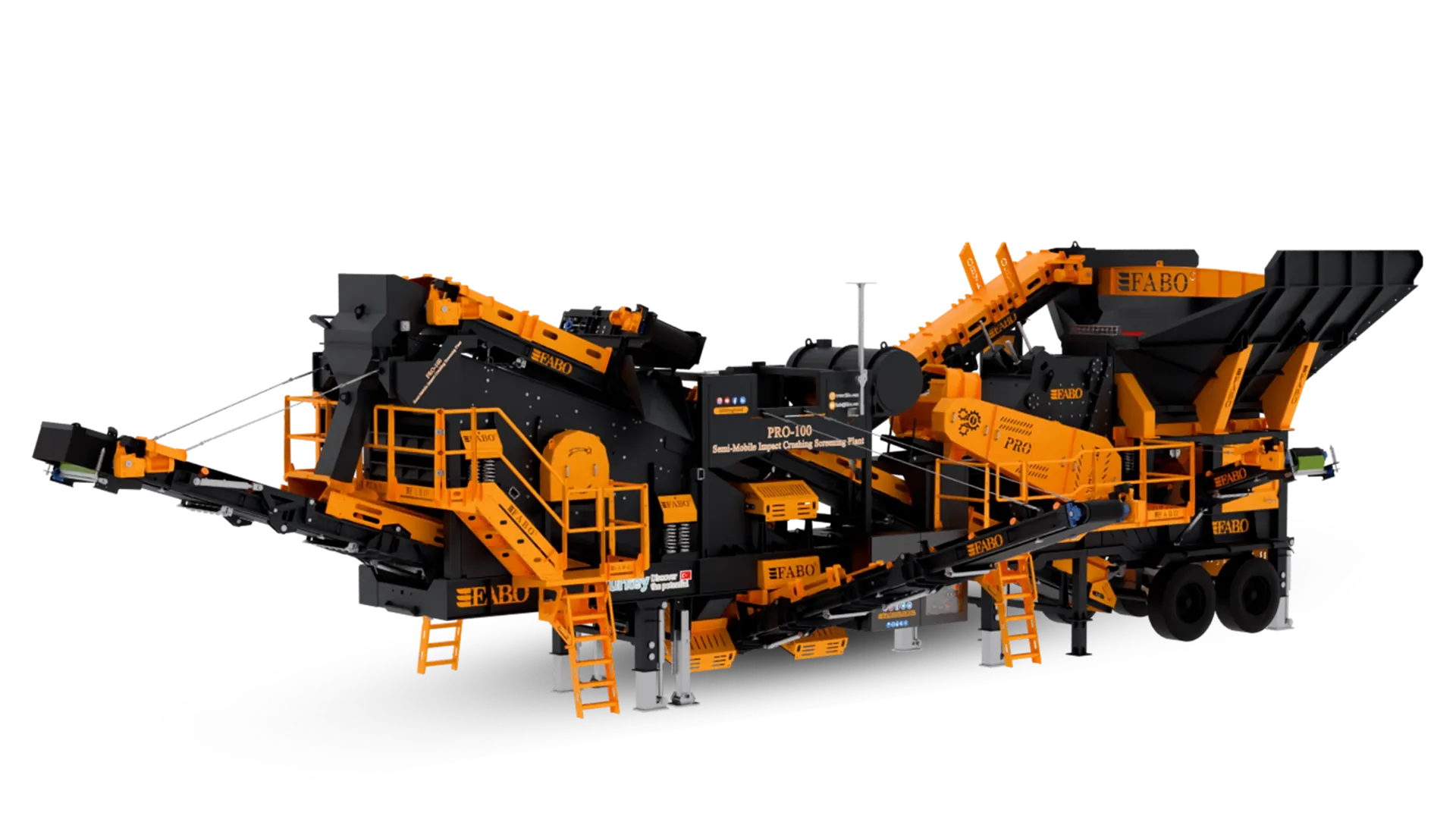 PRO-100 modeli, tek şase üzerinde sistematik bir düzenle; titreşimli besleme bunkeri, opsiyonel wobbler besleyici, bypass bandı, darbeli kırıcı, titreşimli elek, stok ve geri dönüş bantları ile otomasyon sisteminden oluşmaktadır.