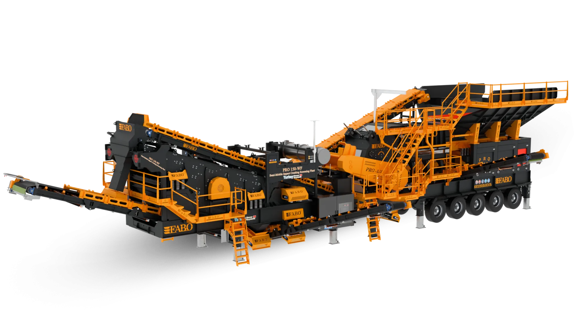 PRO-150 WF modeli, tek şase üzerinde sistematik bir düzenle; titreşimli besleme bunkeri, opsiyonel wobbler besleyici, bypass bandı, darbeli kırıcı, titreşimli elek, stok ve geri dönüş bantları ile otomasyon sisteminden oluşmaktadır.