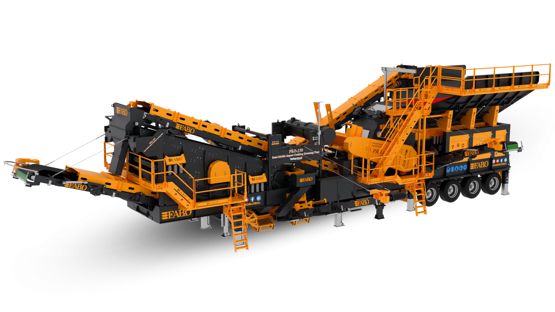PRO-150 modeli, tek şase üzerinde sistematik bir düzenle; titreşimli besleme bunkeri, opsiyonel wobbler besleyici, bypass bandı, darbeli kırıcı, titreşimli elek, stok ve geri dönüş bantları ile otomasyon sisteminden oluşmaktadır.